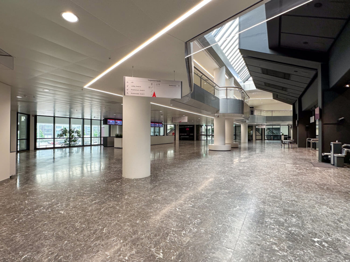 In the complex, all luminaires are controlled by 49 DALI routers. Motion sensors are installed in the meeting and breakout rooms, which switch on the lighting as soon as someone enters the room. The motion detection is also transmitted via BACnet to the building management system to release climate control. The link also allows lighting control via the climate control system control panels.