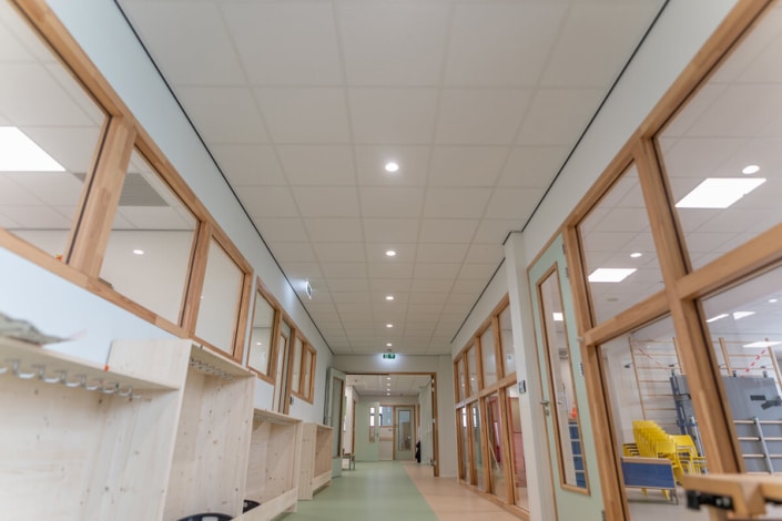 In de lokalen kan de verlichting, dankzij een koppeling, handmatig bediend worden met het bedieningspaneel van het klimaatsysteem.
